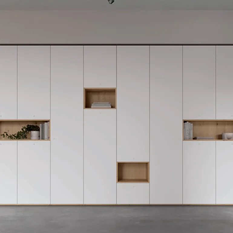 Armario con huecos en diferentes alturas, dibujando así una estética más informal y con mucha personalidad en el interior, a la vez que protege los elementos que hay en el interior.