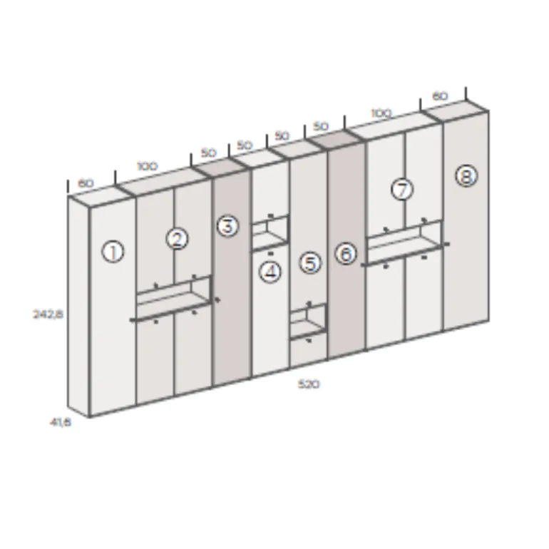 1: 4x estantes – 2: 4x estantes – 3: 4x estantes – 4: 3x estantes – 5: 3x estantes – 6: 4x estantes – 7: 4x estantes – 8: 4x estantes.