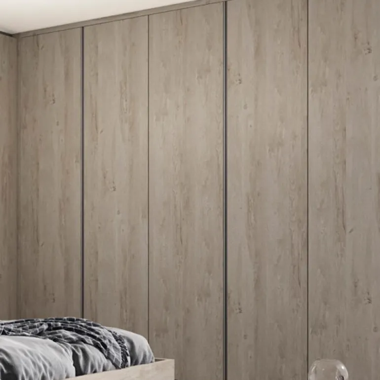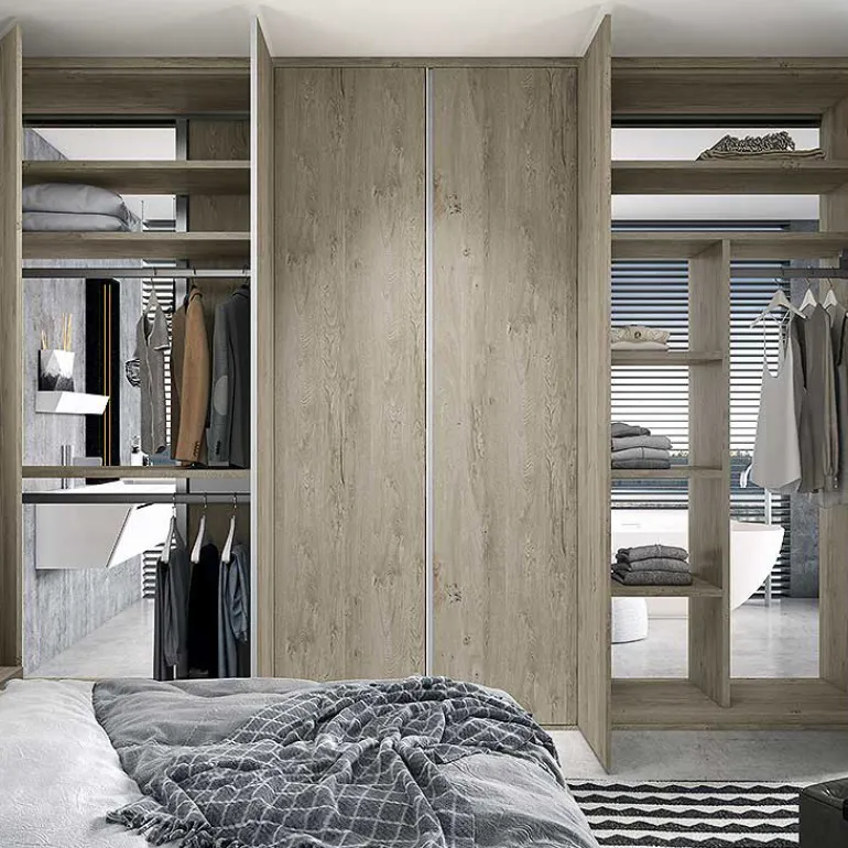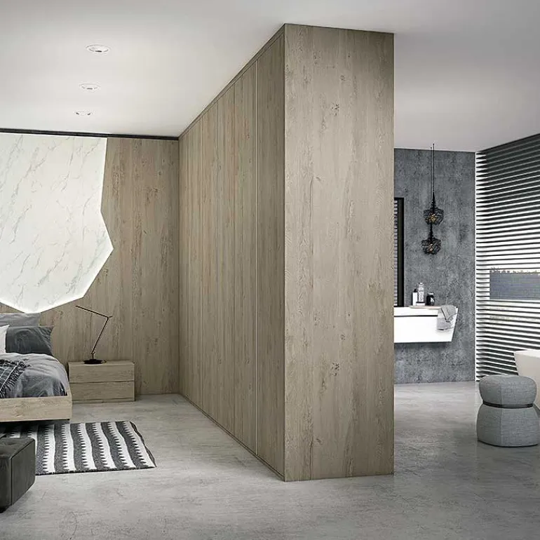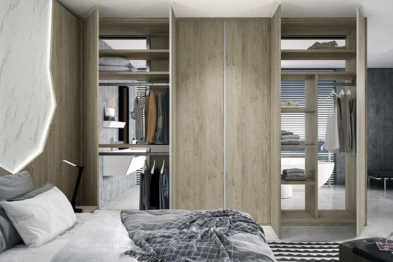 Magnífico armario separador de estancias, fabricado en ecomadera. Destaca por su limpieza, al no tener visibles ni tiradores ni ningún otro elemento, simplemente la vistosidadde la madera, y por sus 6 puertas, dotándolo de gran capacidad de almacenaje.