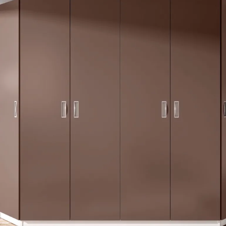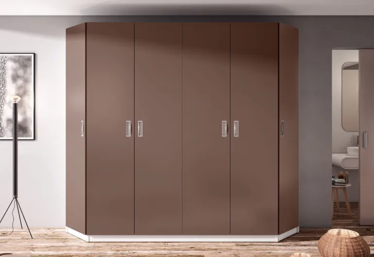 Armario terminal chaflán. Original armario en acabado lacado, con una estética moderna y elegante. Con posibilidad de escoger diferentes acabados lacados y eco-maderas, o incluso cristal lacado. Se le ha añadido dos módulo terminal chaflán a ambos lados (ver catálogo descargable).