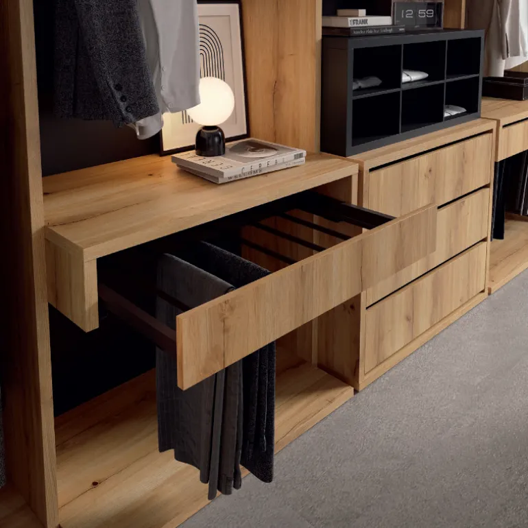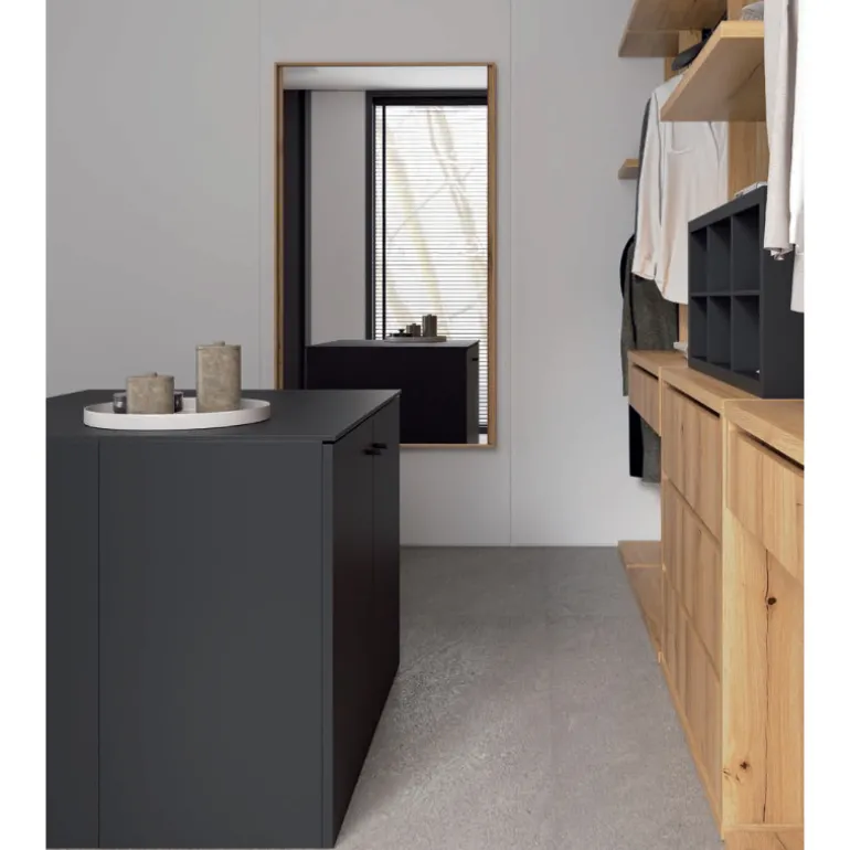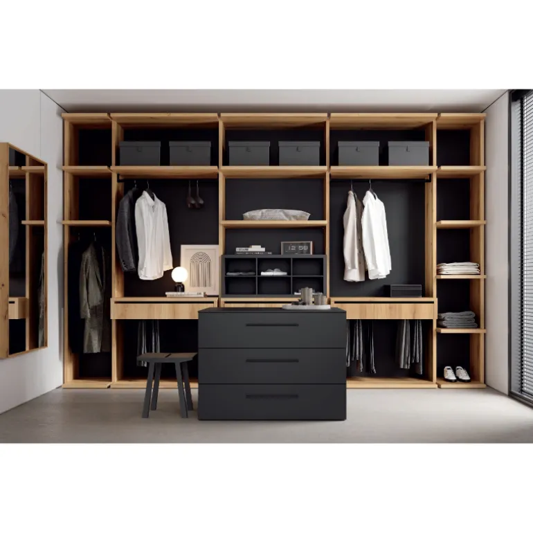 Vestidor abierto a medida con los estantes de más profundidad que los costados. Completa tu vestidor con una isla central de cajones para aquellas prendas que necesitas que estén ocultas a la vista. Los vestidores abiertos nos permiten localizar fácilmente cualquier prenda. Además, son totalmente configurables a medida y color.