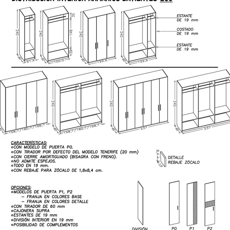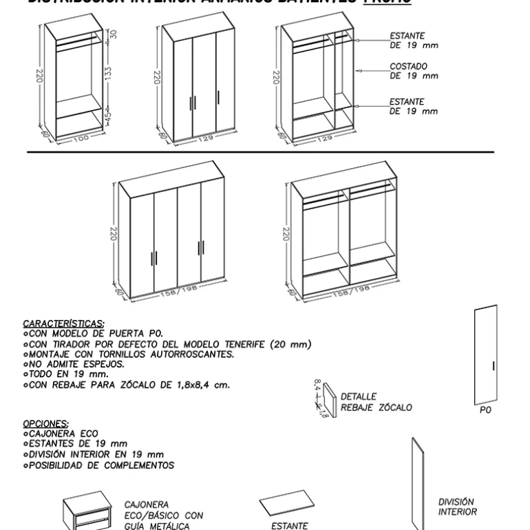 Armario Vida dispone de 3 distribuciones interiores estándar según medidas a escoger: PROMO (para armarios de 220cm de alto), y ECO y SUPRA (para armarios de 240cm de alto). Pero se pueden añadir cajoneras y complementos adicionales. Precio para distribución interior modelo ECO.