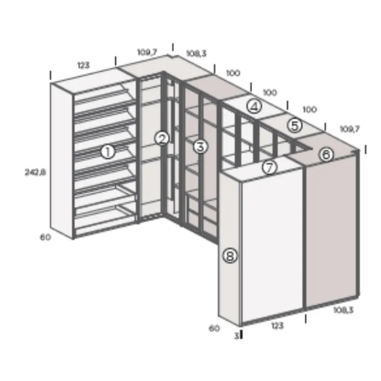 Los armarios con puertas vitrina nos permiten encontrar a simple vista cualquier prenda. Este vestidor cuenta con tres armarios centrales y, en cada esquina, un armario rincón de dos puertas batientes.