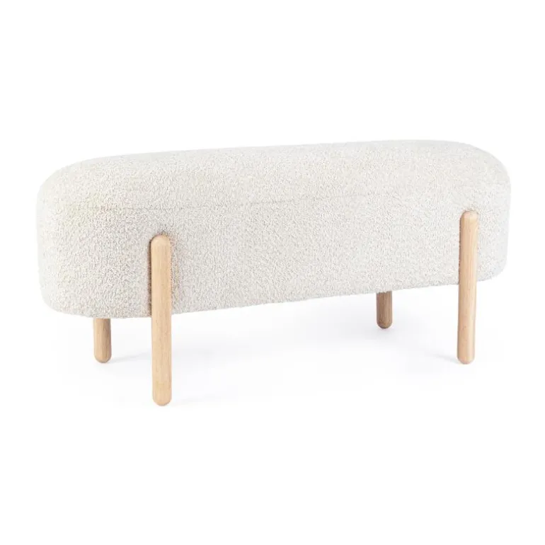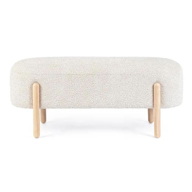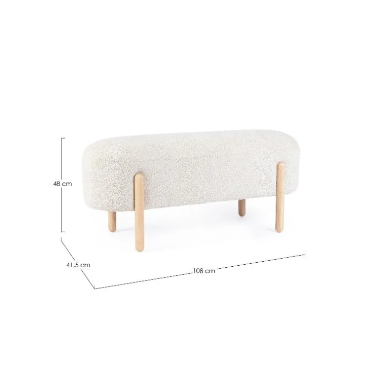 Precioso banco con diseño, tapizado en poliéster efecto buclé. Relleno de espuma, lo que le confiere una gran comodidad en la sentada (densidad 25kg/m3)