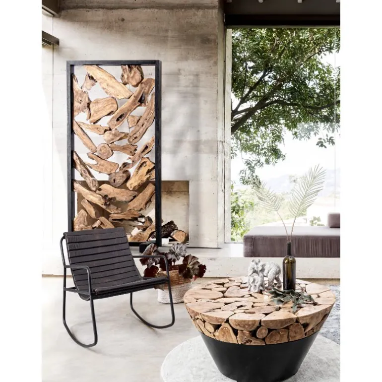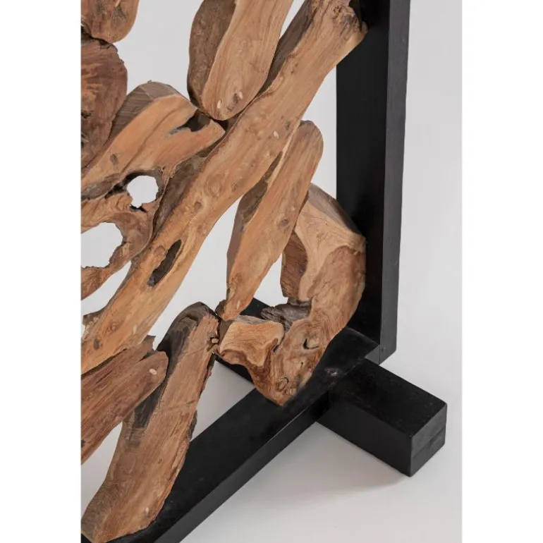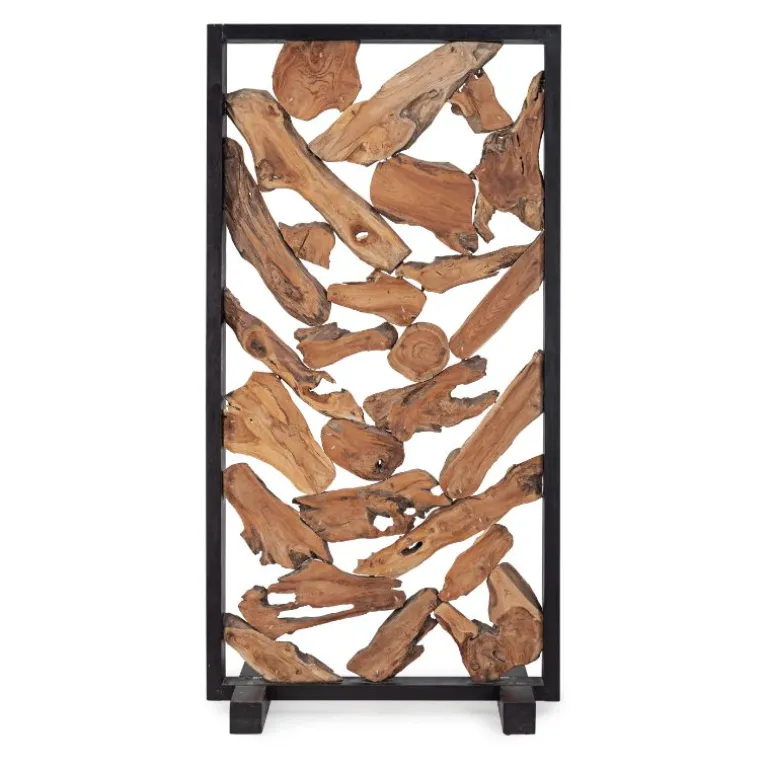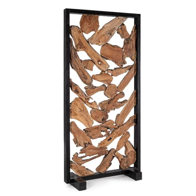 Biombo rústico separador ambientes, fabricado con madera de raíces de teca natural en la zona central, y estructura de madera de meranti.