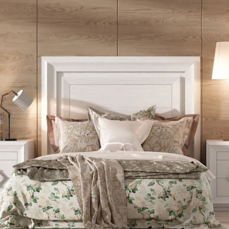 Cabezal de cama de matrimonio, en chapa de Roblenatural de poro abierto blanco, que le otorga un contraste muy elegante,moderno y ligero.
