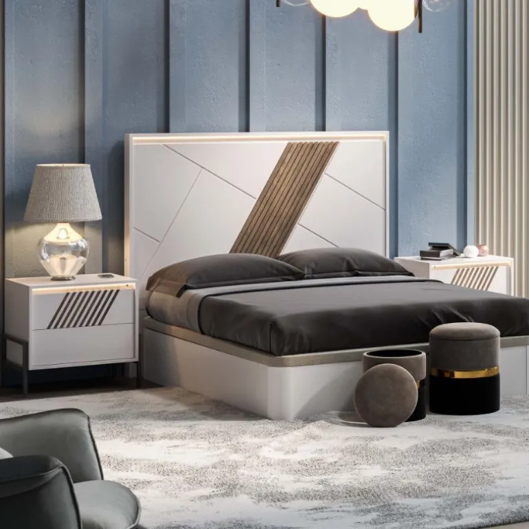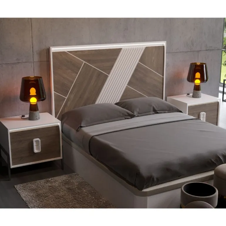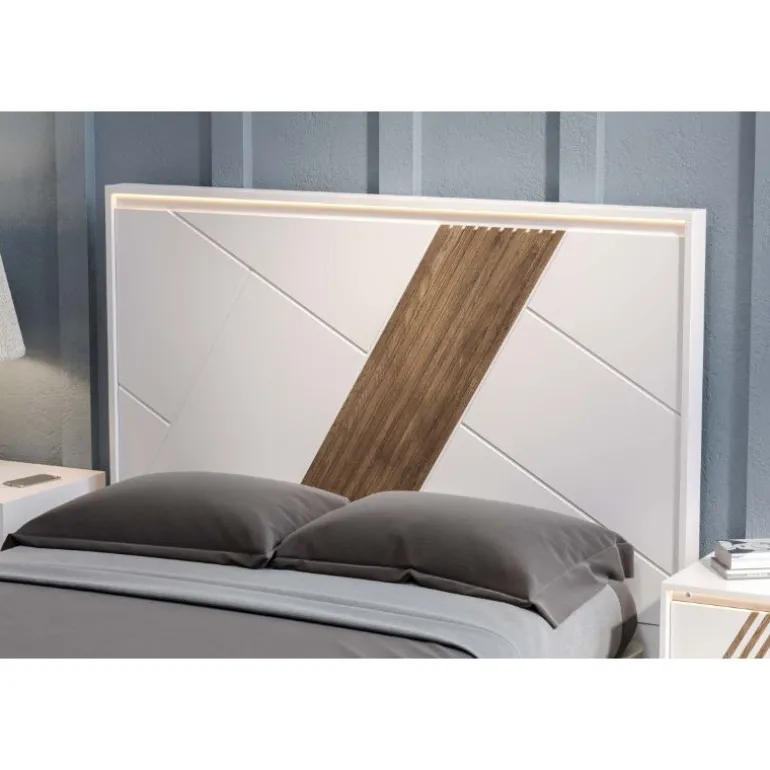 Cabezal de cama de matrimonio, acabado Chapa de Roble N-1 para el Frente, Lacado Blanco el Detalle de láminas paralelas, y Lacado Blanco el Armazón, que le otorga un contraste muy moderno y ligero. Perfecto para dormitorios de matrimonio modernos. Con Luces LED indirectas en la parte superior del cabezal. En 3 medidas para cama de 150, 135 o 105 + mesillas.