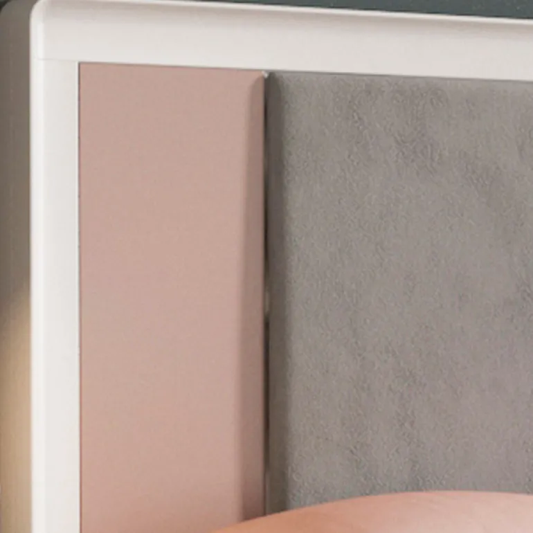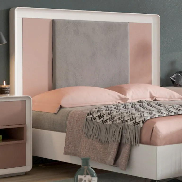 Cabezal de cama de matrimonio, acabado enlacado blanco, con zona central tapizado gris y lacado piedra las franjas laterales, que le otorga un contraste muy moderno y ligero. Perfecto para dormitorios de matrimonio modernos.