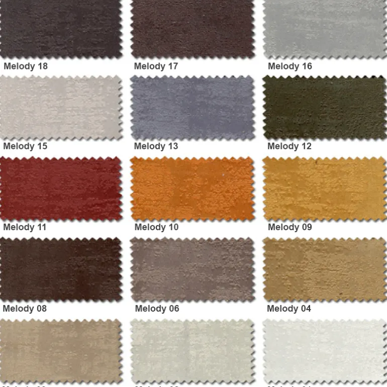 | Tapizado | Melody 01, Melody 02, Melody 03, Melody 04, Melody 06, Melody 08, Melody 09, Melody 10, Melody 11, Melody 12, Melody 13, Melody 15, Melody 16, Melody 17, Melody 18, Melody 19 |