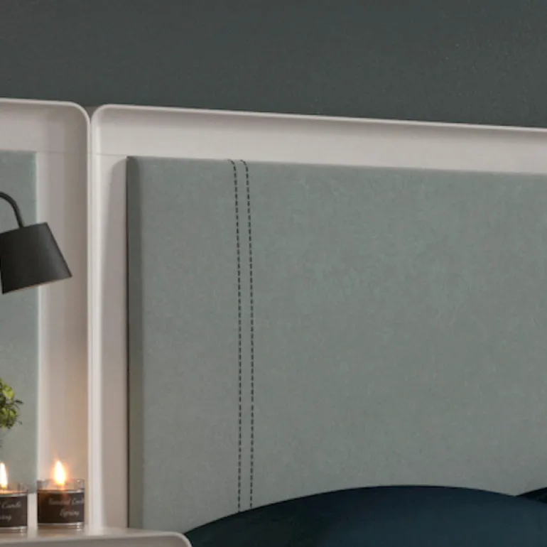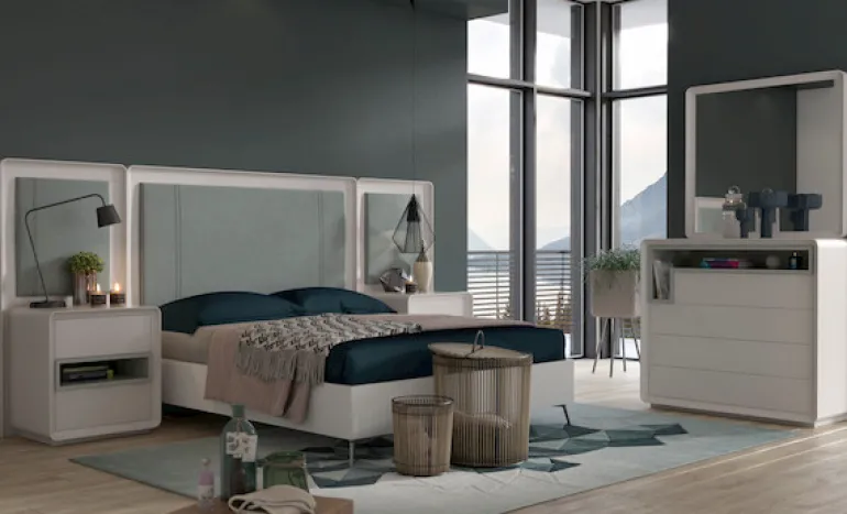 Cabezal de cama de matrimonio, acabado en lacado blanco con tapizado textil gris, que le otorga un contraste muy elegante,moderno y ligero. Con paneles laterales también tapizados en el mismo acabado. Perfecto para dormitorios de matrimonio amplios.