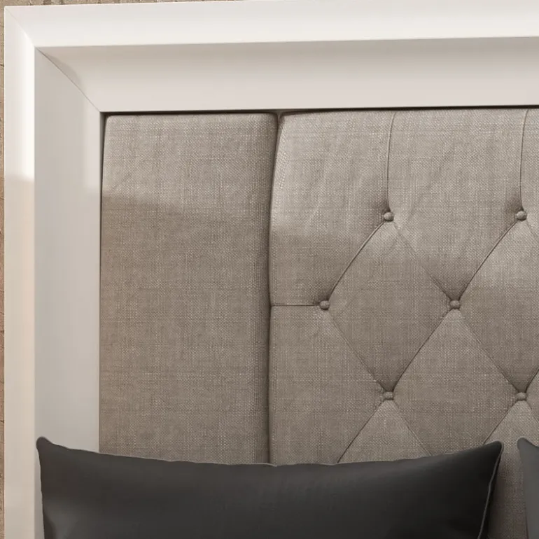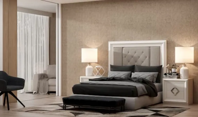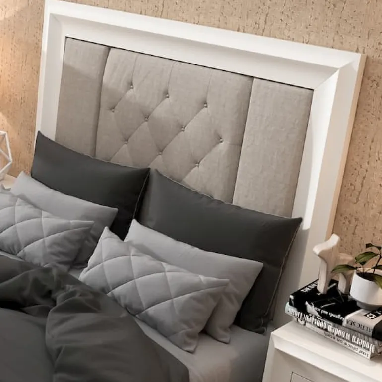 Cabezal de cama de matrimonio tapizada acolchada, acabado en lacado blanco, que le otorga un contraste muy elegante,moderno y ligero.