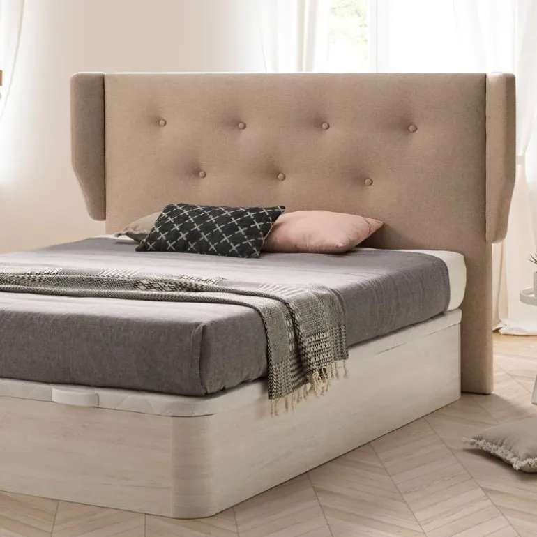 Cabezal tapizado con alas de estilo moderno a la par que vintage, disponible en varios tapizados diferentes. TAPIZADO ROMER ARENA, disponible en otro colores y tapizados.