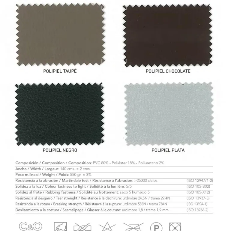 | Tapizado | DENVER 01, DENVER 02, DENVER 03, DENVER 09, DENVER 13, DENVER 14, DENVER 15, DENVER 17, DENVER 19, DENVER 21, Polipiel BLANCO, Polipiel CENIZA, Polipiel CHOCOLATE, Polipiel GRIS, Polipiel HIELO, Polipiel NEGRO, Polipiel PIEDRA, Polipiel PLATA, Polipiel TAUPE, Polipiel VISÓN |