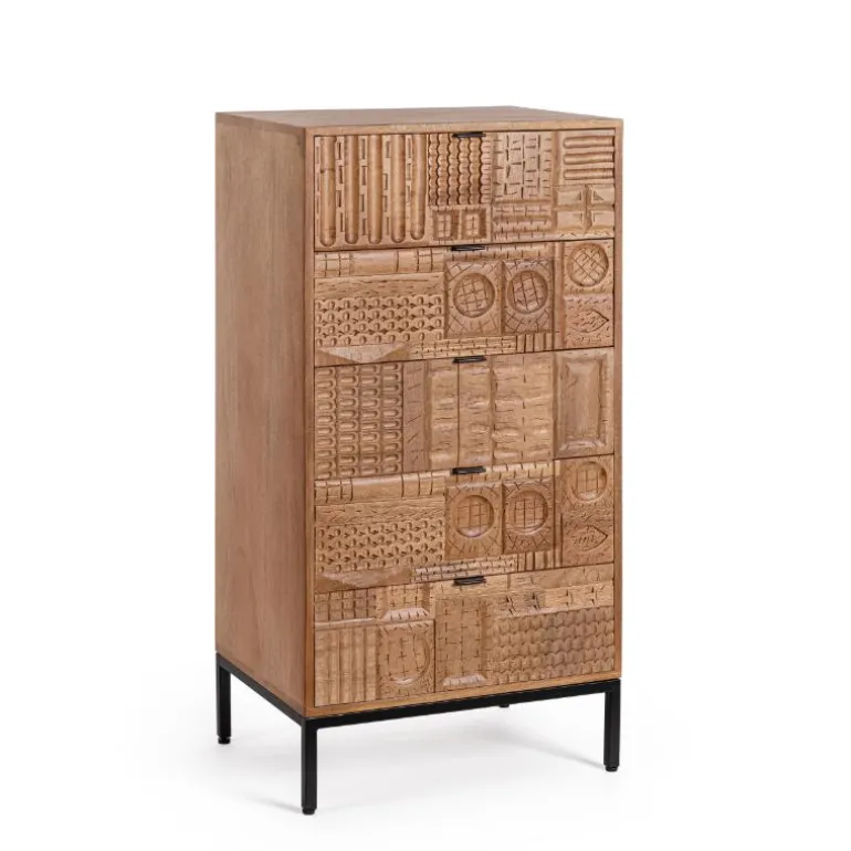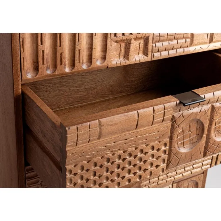 Estructura de madera de mango maciza. Trasera de DM. Acabado a base de nitrocelulosa. Patas y tiradores de acero negras. Frentes de los cajones con incrustaciones y tallas hechos a mano.