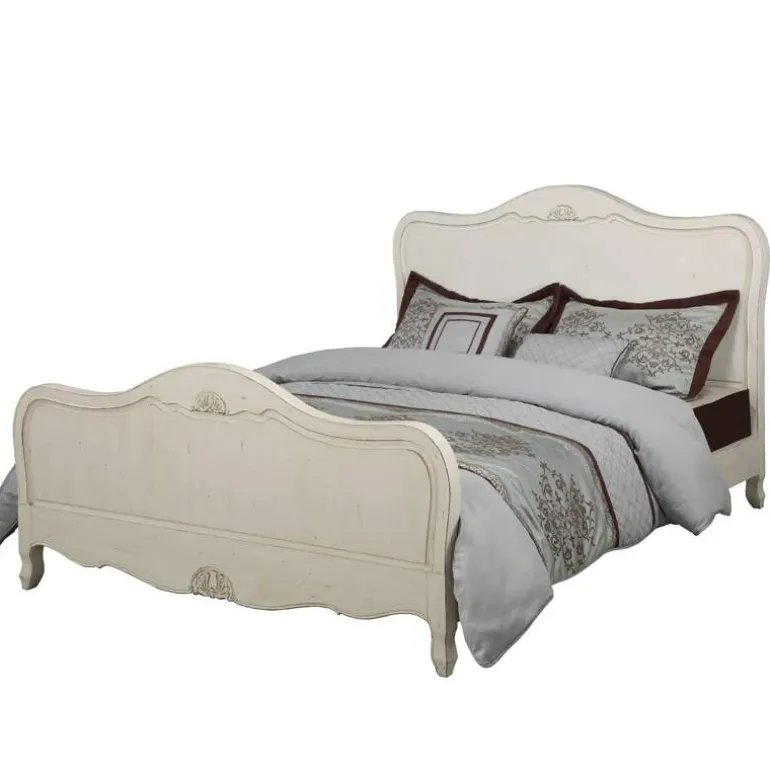 Cama de matrimonio de estilo vintage fabricada en madera maciza de Mindi, con un gran trabajo artesanal donde podemos encontrar diferentes tallas desgastada por su acabado blanco rozado, dejando salir el gris de la imprimación. Dotará a tu dormitorio de un estilo romántico muy acogedor.