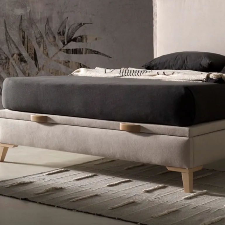Canapé con arcón de madera y patas de MADERA NATURAL, en acabado TAPIZADO INDIGO 7, disponible en varios acabados de eco-madera diferentes. Tapa TAPIZADA 3D color crudo, y tirador de MADERA NATURAL.