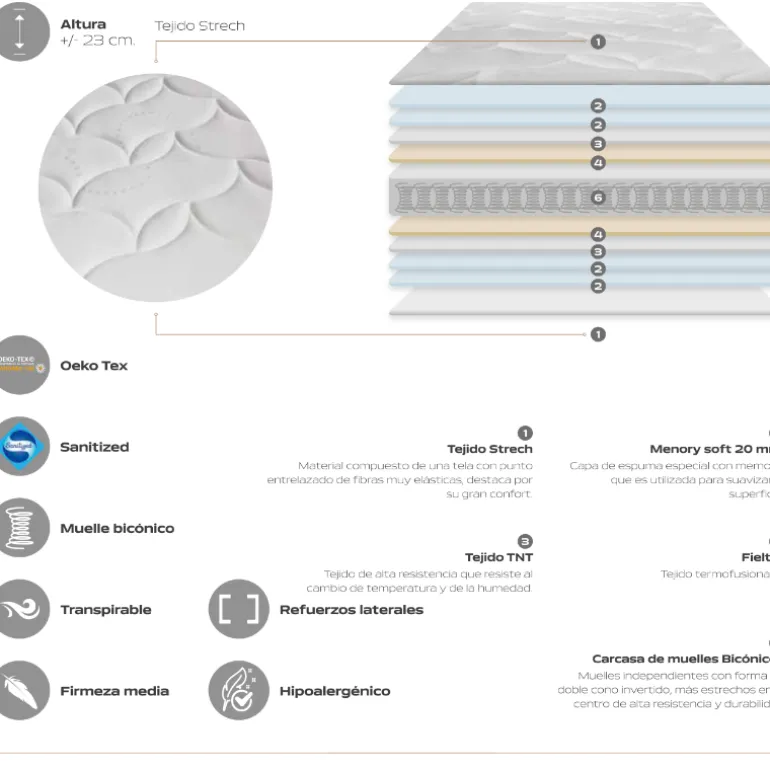 Tejido Oeko TEX con fabricación Sanitized. Muelle bicónico. Transpirable. Firmeza media. Refuerzos laterales. Hipoalergénico.