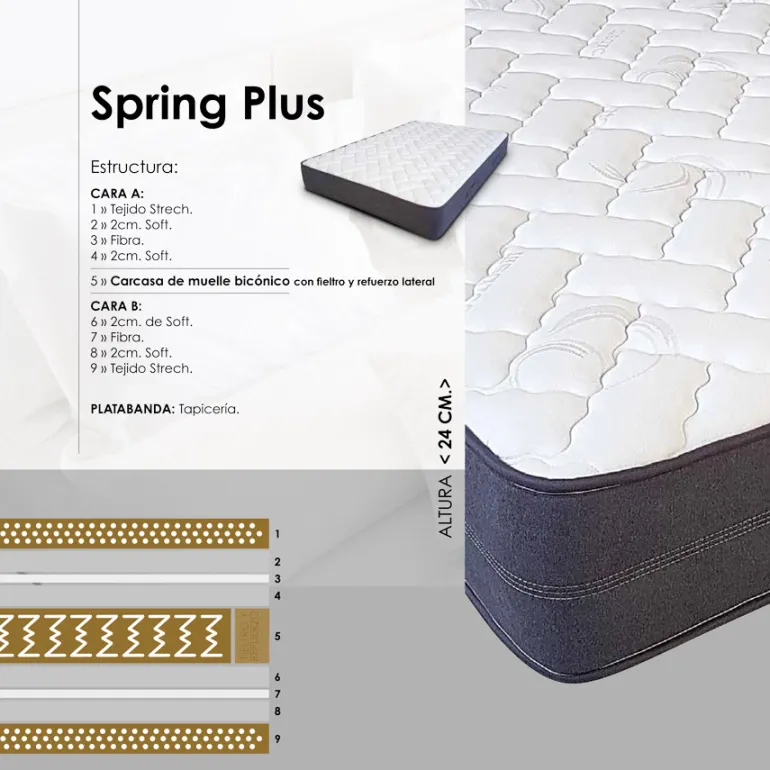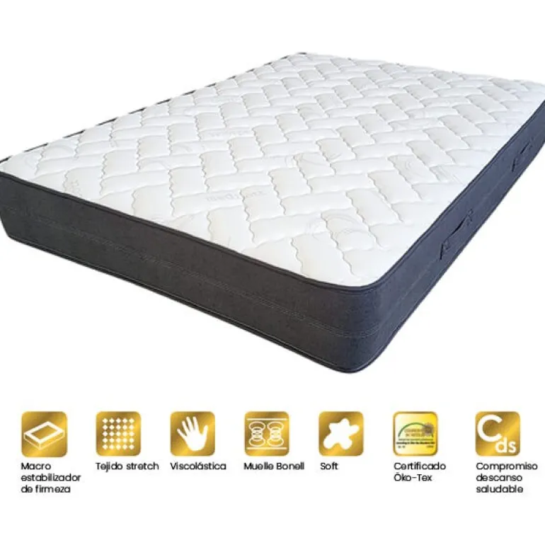 Colchón de muelle bonel con refuerzo perimetral. Fabricado con: Tejido strech es un material compuesto por una tela con punto entrelazado de fibras muy elásticas que destaca por su gran confort. Tejido TNT es un tejido de alta resistencia que soporta el cambio de temperatura y la humedad. Memory soft 20 mm es una capa de espuma especial con memoria que se utiliza para suavizar la superficie. Fieltro, es un tejido termofusionado. Carcasa de muelles Bicónicos, son muelles independientes con forma de doble cono invertido, más estrechos en el centro para mayor amortiguación, de alta resistencia y durabilidad.
