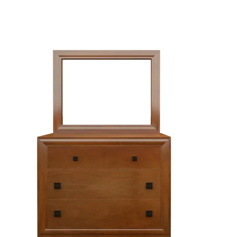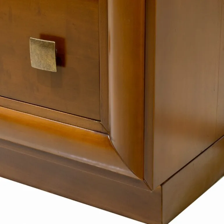 Fabulosa cómoda con 2 amplios cajones y otros 2 más pequeños donde poder guardar ropa y demás enseres personales, con guías metálicas. Esta realizada en chapa natural Aliso (familia del cerezo), acabado cerezo suave y patinado para resaltar todas sus molduras y formas. Tiradores acabados en oro envejecido. Con tiradores en forma cuadrada acabado oro envejecido y con 2 cajones con guías metálicas. Ideal para dormitorios estilo contemporáneo.