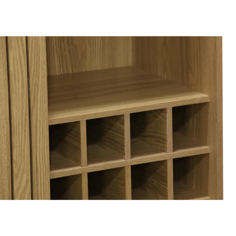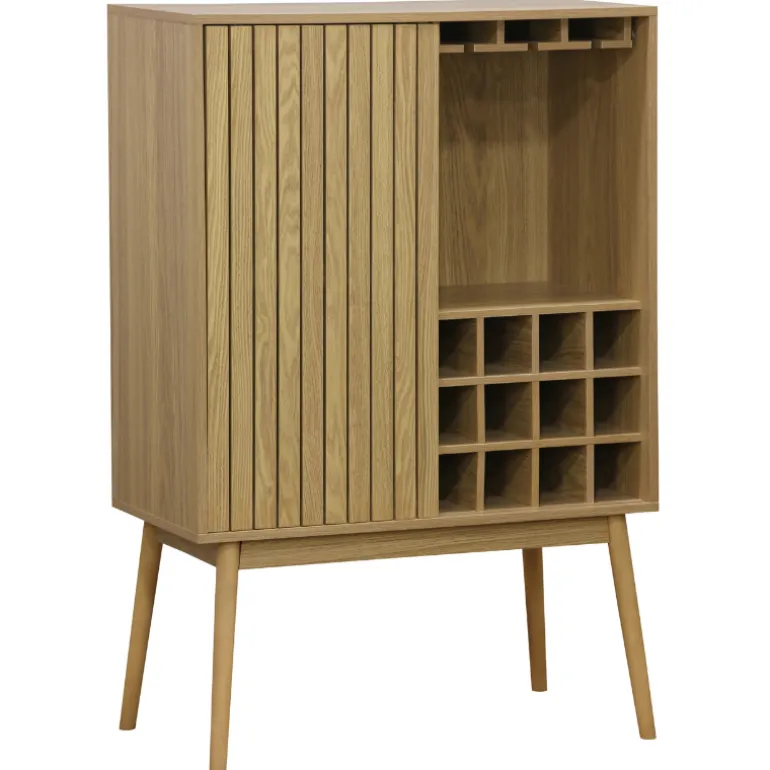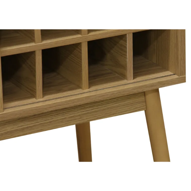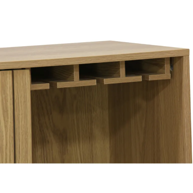 Consola con botellero para 12 botellas y 3 colgadores para almacenaje de copas, para almacenar unas 12 copas aprox., a la última en tendencia de decoración, en chapa natural de Fresno y laminado fresno, con patas de madera. Con frentes de puertas alistonados, un estilo moderno en decoración.