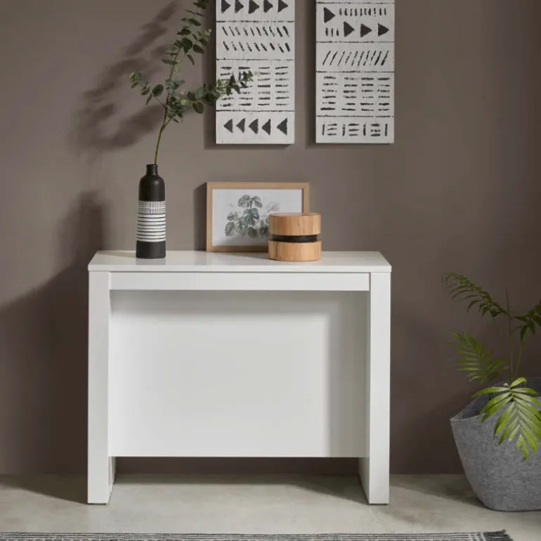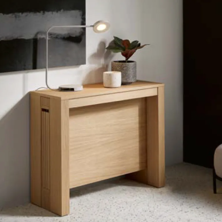 Moderna consola extensible a mesa de comedor fabricada en acabados ecomadera o Chapa de Roble o Haya Natural.