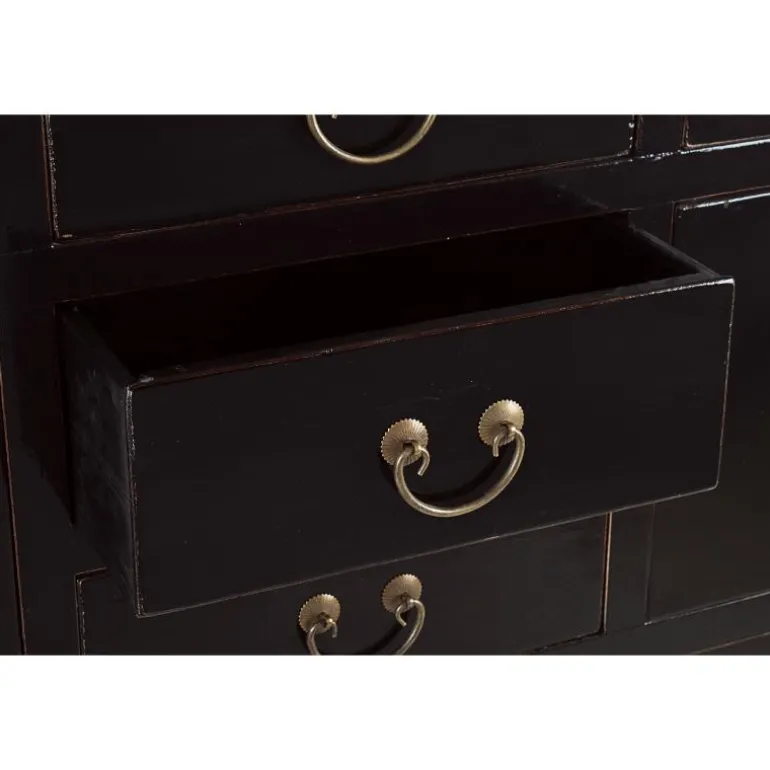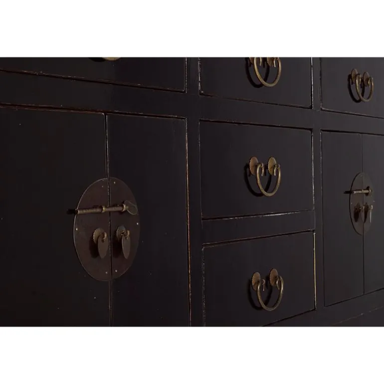 Estructura de madera de Olmo maciza. Acabado negro brillo patinado a base de agua. Tiradores de cobre.