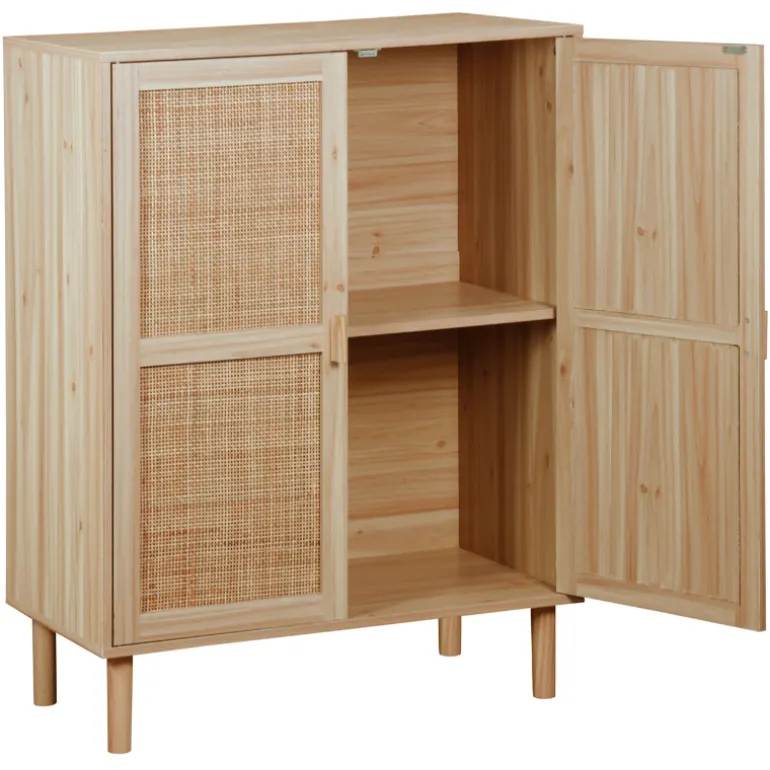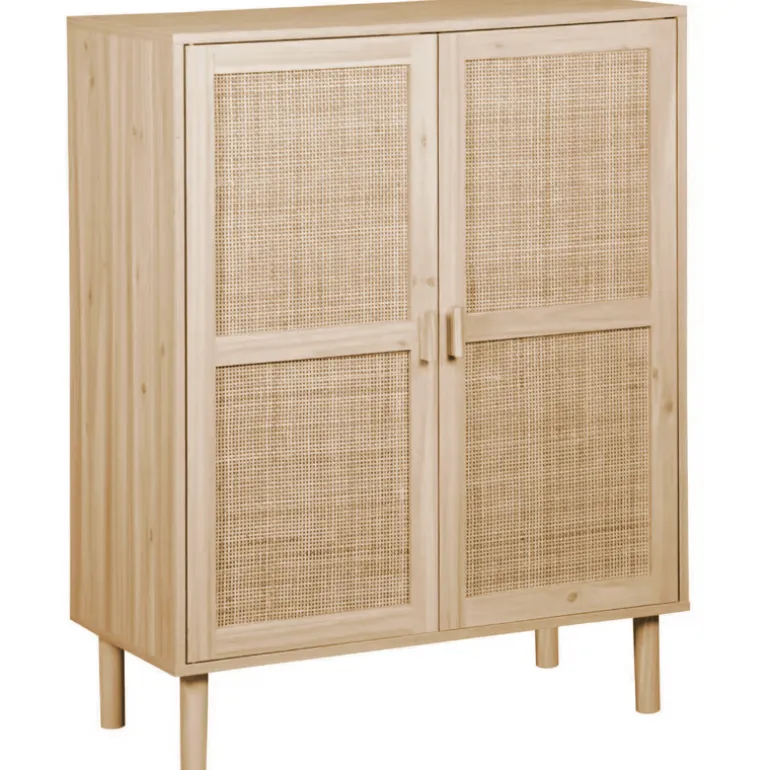 Consola alta para almacenaje en acabado pino laminado, con patas en madera de pino. Frentes de puertas con paneles decorativos en rattán.