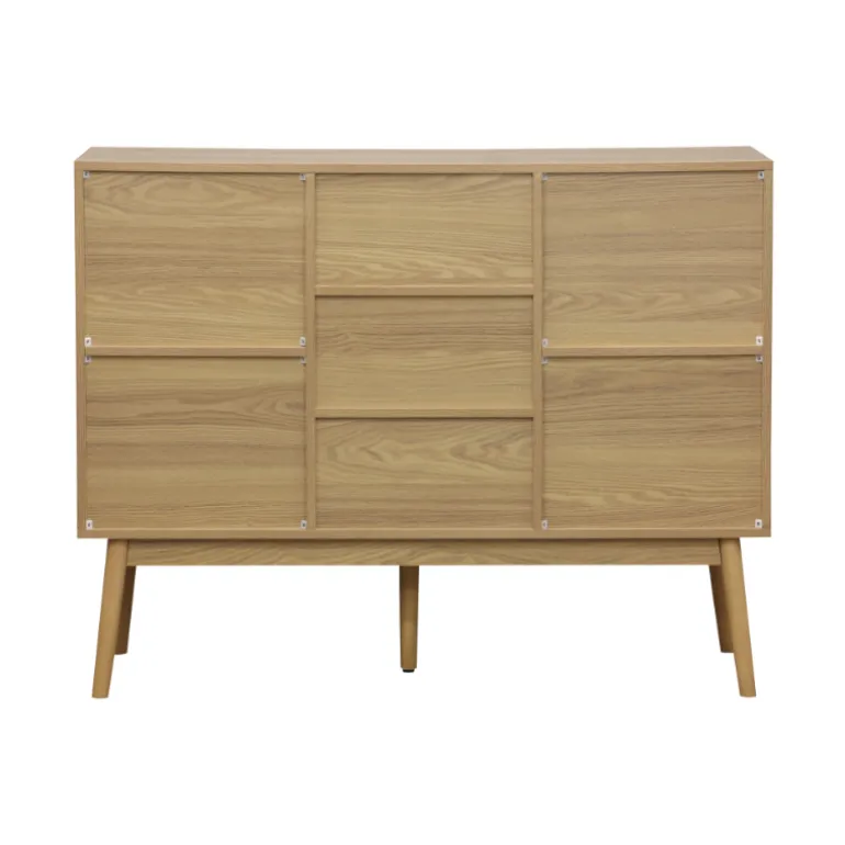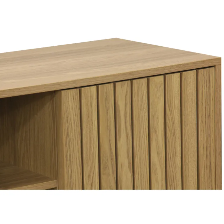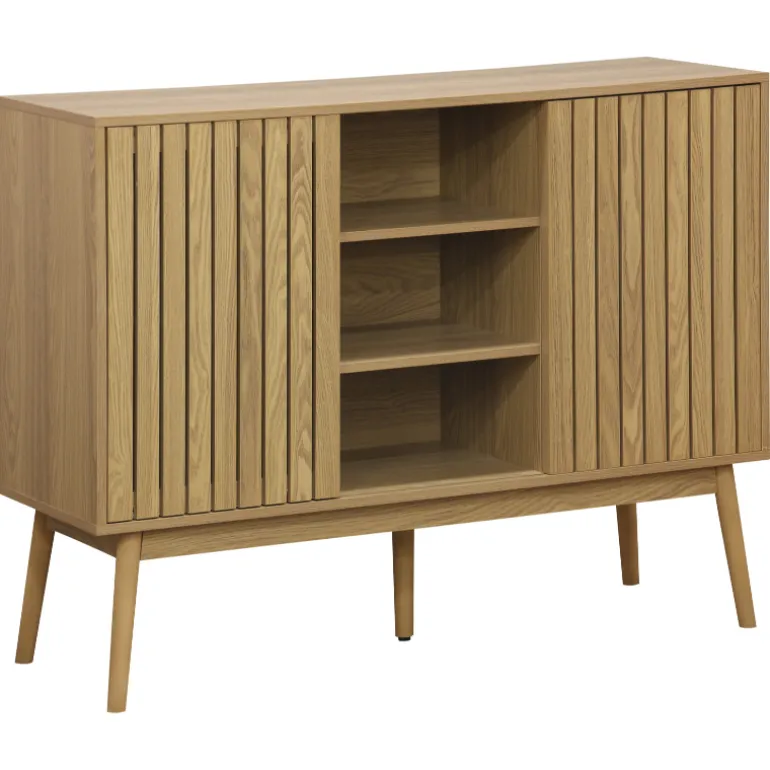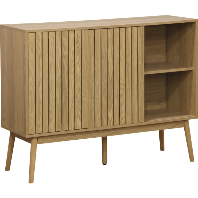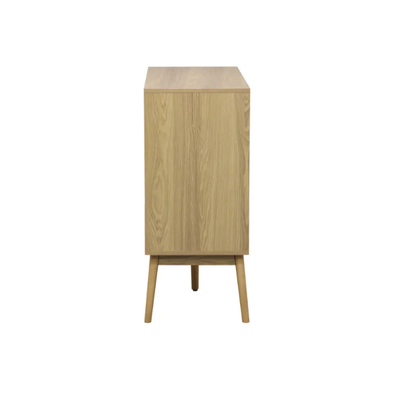 Consola a la última en tendencia de decoración, para almacenaje en chapa natural de Fresno y laminado fresno, con patas de madera. Con frentes de puertas alistonados, un estilo moderno en decoración.