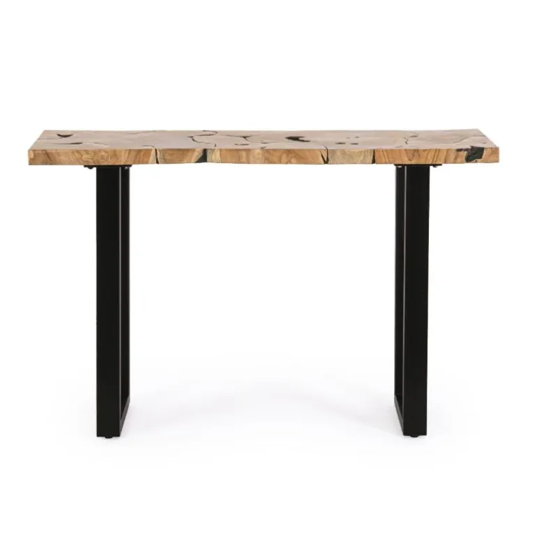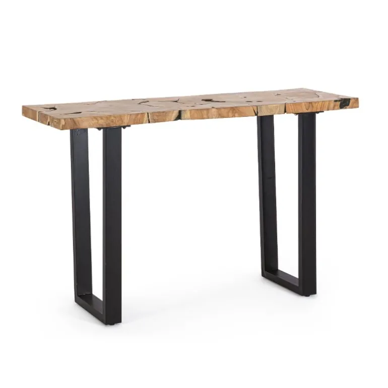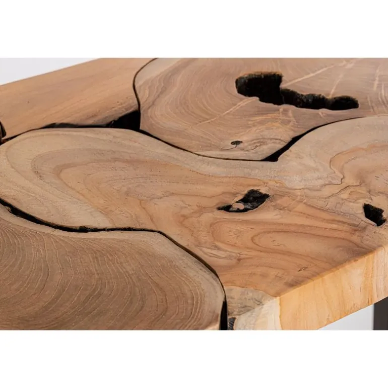 Consola con tapa original de raíces de teca. Acabado a base de nitrocelulosa. Y patas en acero pintado.