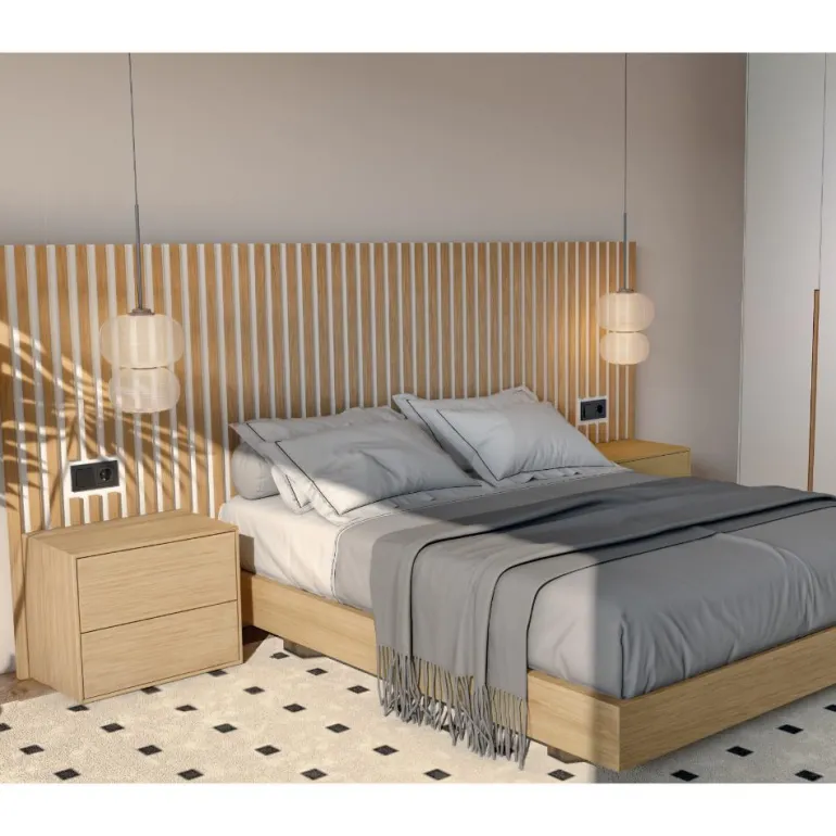 Dormitorio con cabezal alistonado, de estilo moderno y la mejor calidad fabricado en CHAPA DE ROBLE NATURAL, que gracias a la madera de roble aporta una calidez que pocos materiales pueden dar. Combinado con dos mesillas también en chapa de roble, con 2 cajones con sistema de apertura push, de muy fácil uso, que con pulsar sobre los cajones, se abrirán.