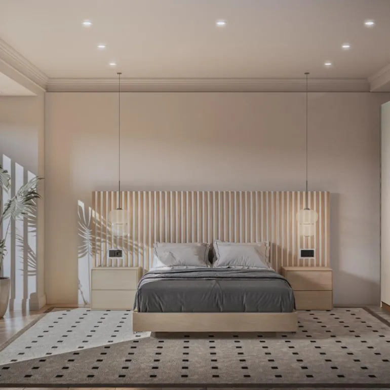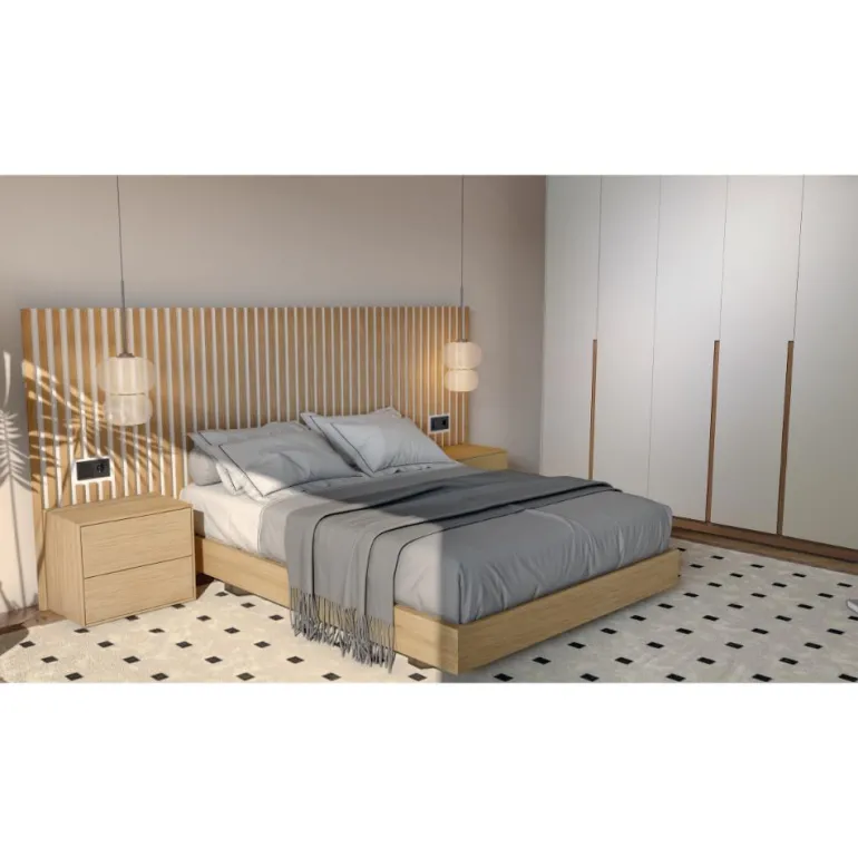 Dormitorio de matrimonio de gran calidad de fabricación, compuesto por un gran cabecero creado a base de listones de madera, y de un panel trasero Lacado Blanco Panna (es posible Lacar en cualquier color o Chapa de madera natural), lacado artesanal de gran calidad, que le aporta luminosidad. Y una bancada también en chapa de roble natural, para colchón de 150*190 cm.