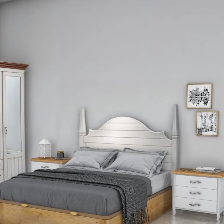 Cabecero y mesillas lacadas + patinado en tonos grises, acabado artesanal. Encimera de las mesillas de chapa de roble natural barnizado natural y tiradores forjados en forma de “S” invertida, acabado plata envejecida.