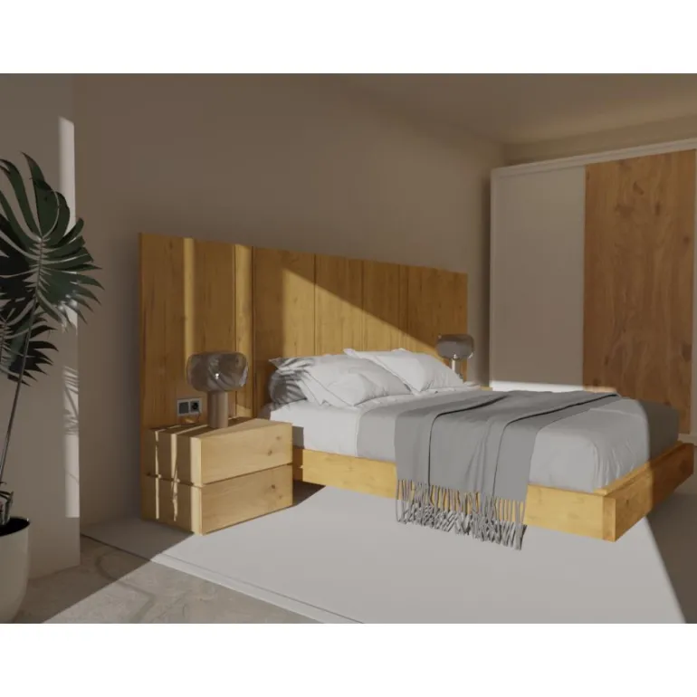 Dormitorio de matrimonio de gran calidad de fabricación, compuesto por un gran cabecero creado a base de tablones de diferentes anchuras y de 6 cm de grosor en chapa de roble salvaje con nudos. Dos mesillas fabricadas por completo en chapa de roble con nudos, y con dos cajones cada una, con sistema de apertura push, que tan solo pulsando sobre los cajones, se abrirán. Y una bancada suspendida también en chapa de roble con nudos para colchón de 150*190 cm.