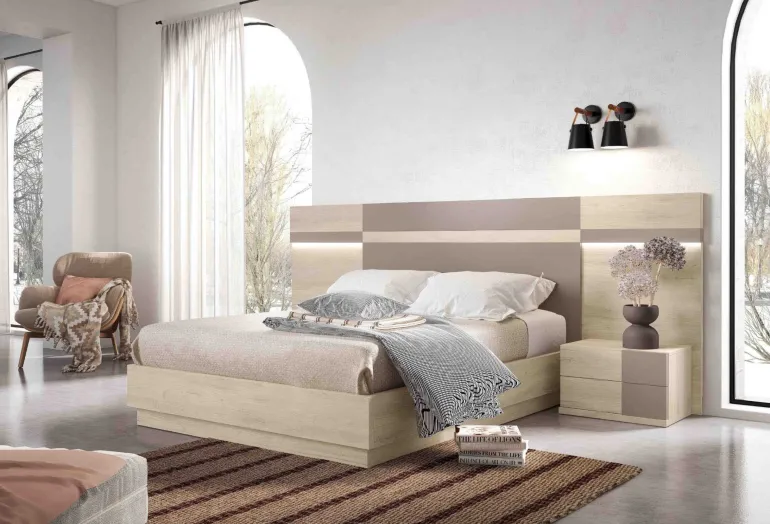 Dormitorio Dremen Aurora. Dormitorio de matrimonio con un diseño actual y moderno, en fotografía está en acabados ecomadera Roble Aurora y Lacado Volcán, una combinación que contrasta muy bien, pero puede escoger la que usted prefiera. Y mesitas de 2 cajones en mismos acabados ecomadera Aurora y tiradores uñero vertical en acabado Lacado Volcán, y bancada elevable con arcó y zócalo, además de iluminación LED incluida.