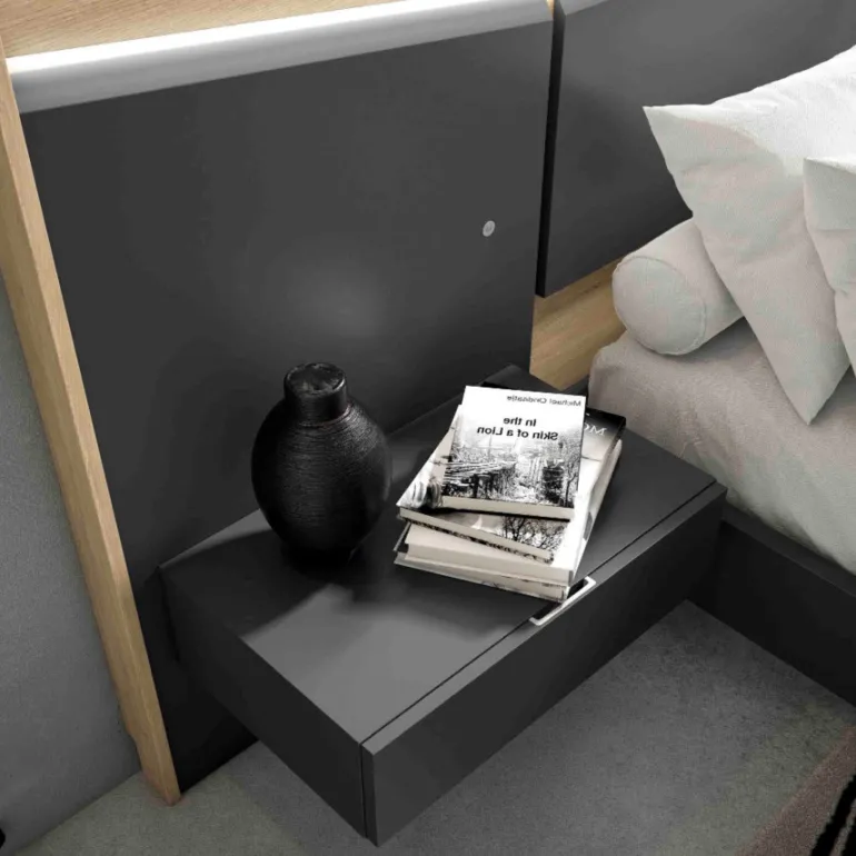Dormitorio Lin Antracita. Dormitorio de matrimonio con un diseño actual y moderno, en fotografía está en acabados ecomadera Roblerus y zona central Lacado Pizarra, una combinación que contrasta muy bien, pero puede escoger la que usted prefiera. Y mesitas en mismo acabado Lacado Pizarra con tirador uñero pequeño en aluminio mate, y bancada volada en Laca Pizarra, además de iluminación LED incluida.