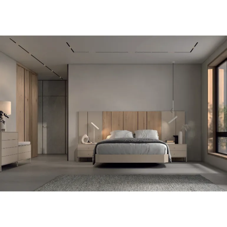 Vanguardista dormitorio de matrimonio de estética muy actual .Combinando los acabados roble Nut y Taupe, podemos conseguir dormitorios tan modernos como este, y las nuevas mesitas con patas metálicas, nos permite dar continuidad a la estética vertical que nos presentan éste cabecero, y la nueva bañera suspendida con esquinas angulares, con posibilidad de escoger entre muchas bancadas diferentes (ver imágenes).