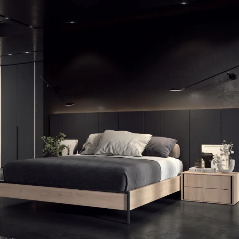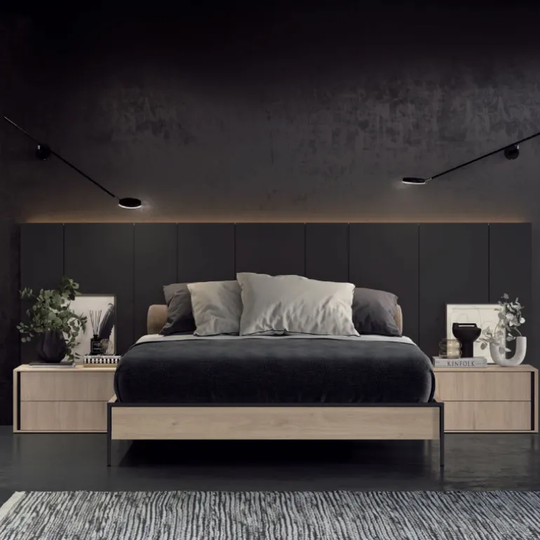 Vanguardista dormitorio de matrimonio de estética muy actual .Combinando los acabados Carbón y Noce, podemos conseguir dormitorios tan modernos como este, y las nuevas mesitas, nos permite dar continuidad a la estética vertical que nos presentan éste cabecero, y la nueva bañera con estructura metálica negra.