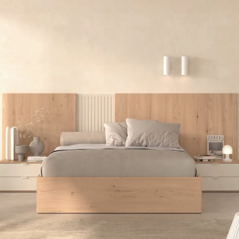 Vanguardista dormitorio de matrimonio de estética muy actual, formado por cabezal en dos acabados, en ecomadera Roble Nut y Arena, con iluminación LED, donde dispone de un detalle con forma alistonada muy moderno bonito. Incluye dos mesillas con 2 cajones amplios con tiradores discretos (opción de tiradores en cualquier otro color y diseño – ver imágenes). Con bañera ingletada en Roble Nut, con bañera elevable.