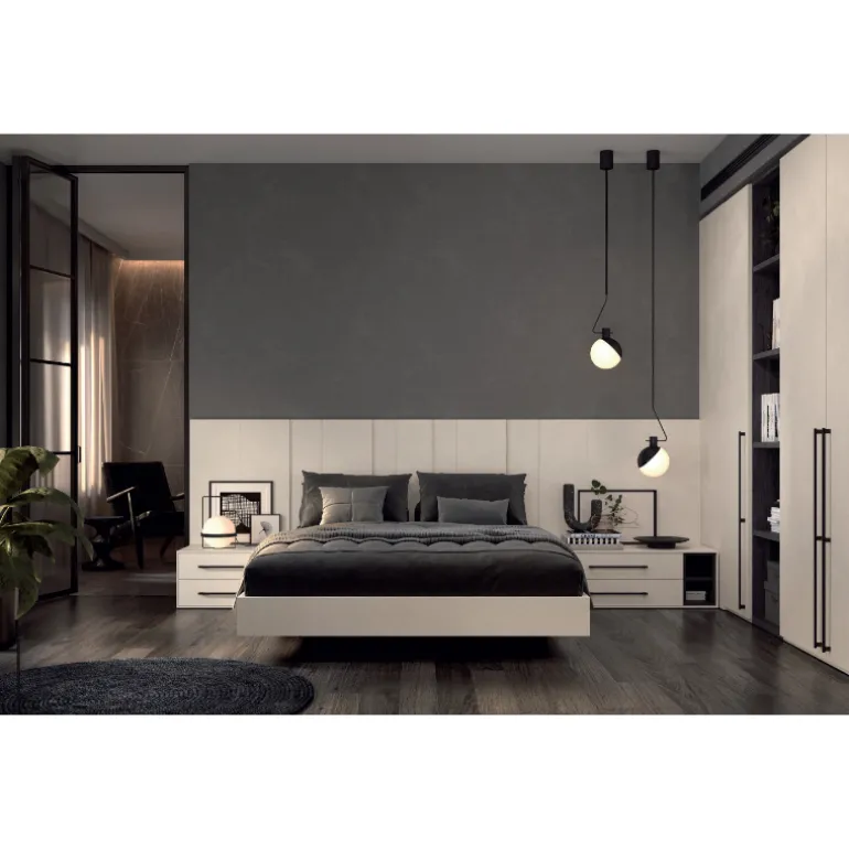 El cabecero Isa se caracteriza por tener un contraste de profundidades entre los paneles que lo componen. Nos permite hacer composiciones sobrias como esta en el que utilizamos el color Pietra como único acabado, o bien combinarlo de tantos colores como paneles tiene el cabecero.