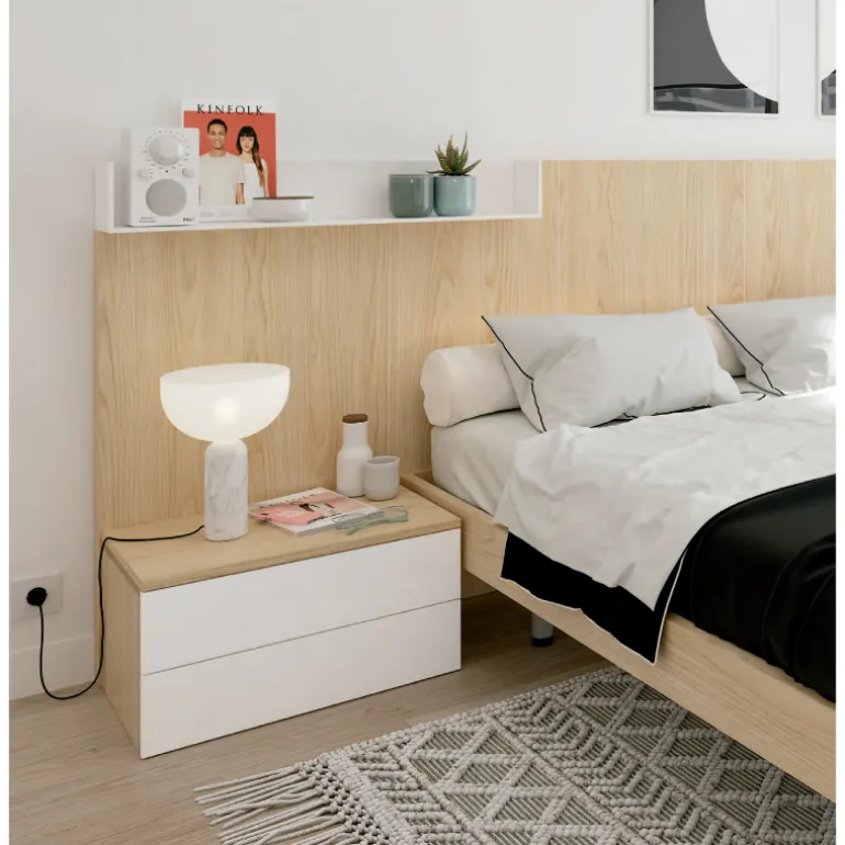 Vanguardista dormitorio de matrimonio de estética muy actual, formado por cabezal en acabado roble Miel, con una pequeña estantería en Blanco Mate (posibilidad de cualquier color liso), que incluye dos mesillas con 2 cajones en Blanco Mate y amplios, con tiradores Line. Con posibilidad de luz LED en la parte superior del cabezal.