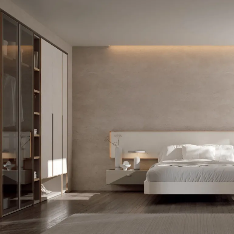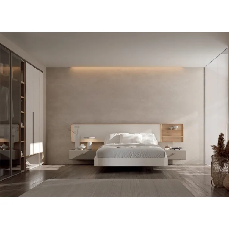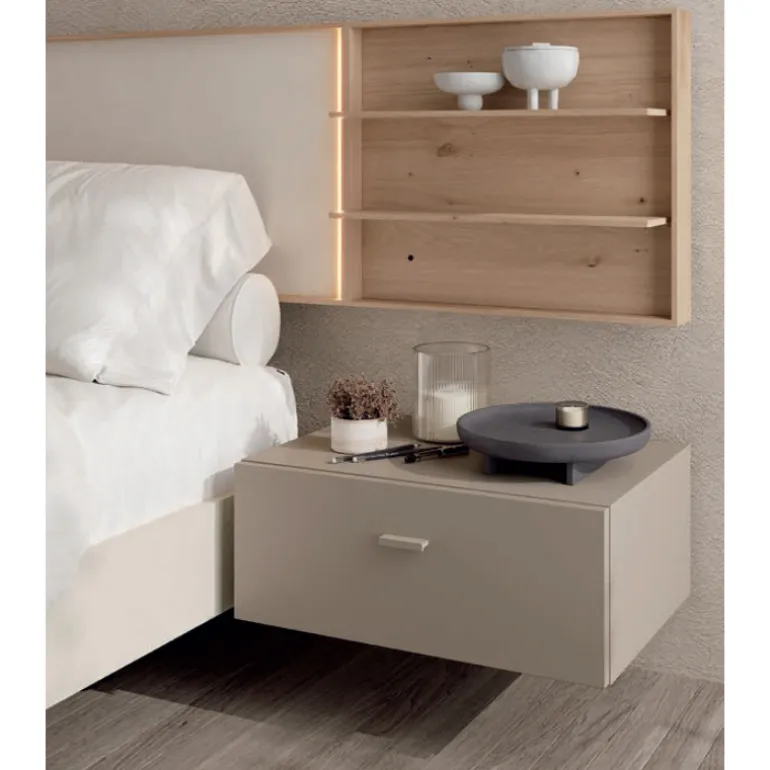 El cabecero Sia colgado se puede personalizar con estantes decorativos. Puedes colocarlos en los dos costados del cabecero o simplemente en uno si prefieres las asimetrías, como ocurre en este detalle.