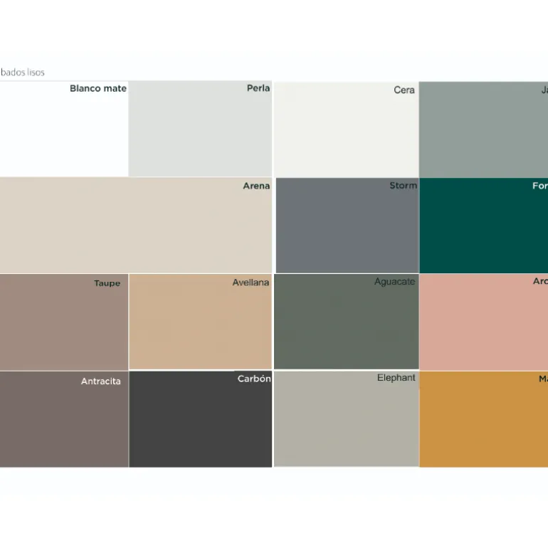 | Acabado bañera | Aguacate, Antracita, Arcilla, Arena, Avellana, Blanco mate, Carbón, Catania, Cera, Cotton, Elephant, Forest, Jade, Maíz, Noce, Nut, Perla, Pietra, Roble África, Roble Crack, Roble Nero, Roble Organic, Storm, Taupe |