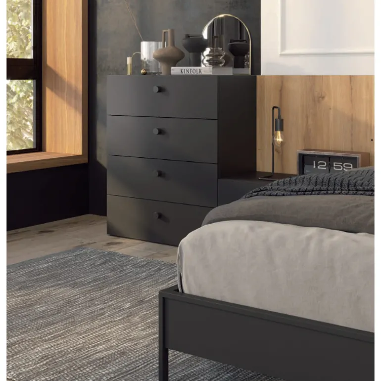 También disponible para ésta composición una Cómoda de5 cajones con tarima, enacabadolacado Antracita y tiradores Line en antracita (opción de tiradores en otro color), muy moderno, con opción de cualquier acabado y diferentes medidas. Y cubos de metal en diferentes colores. Y un armario de 4 puertas batientes, disponible en la sección de Armarios de ésta web con todas las especificaciones técnicas. No incluidos en el precio total.