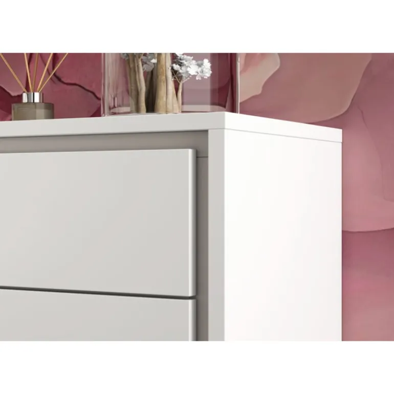 Está fabricado en ecomadera e incluye sistema de retención en sus cajones, para evitar golpes y prolongar la vida útil del cajón. Con un bonito cabezal en el que se combinan diferentes acabados.