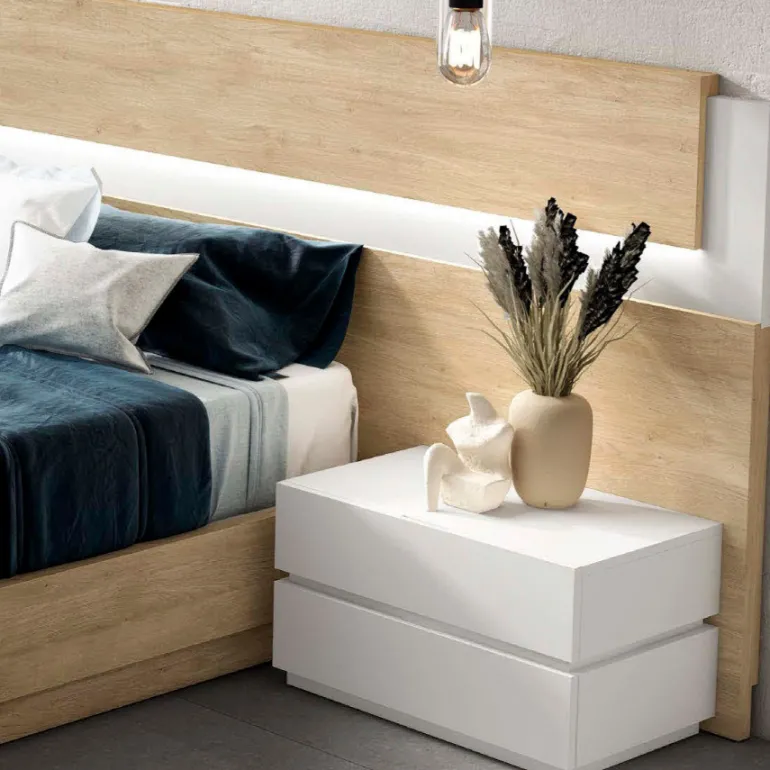 Está fabricado en ecomadera e incluye sistema de retención en sus cajones, para evitar golpes y prolongar la vida útil del cajón. Con un bonito cabezal en el que se combinan diferentes acabados y 2 mesillas en blanco con2 cajones y tiradores uñeros metálicos.