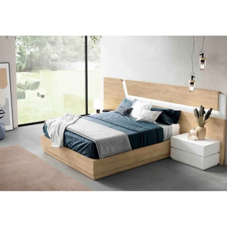 Dormitorio moderno frey roble. Dormitorio de matrimonio con un diseño actual y moderno, en fotografía está en acabado ecomadera Roblerus, e interior en ecomadera Blancera, y mesitas en ecomadera Blancera, además de iluminación LED incluida.