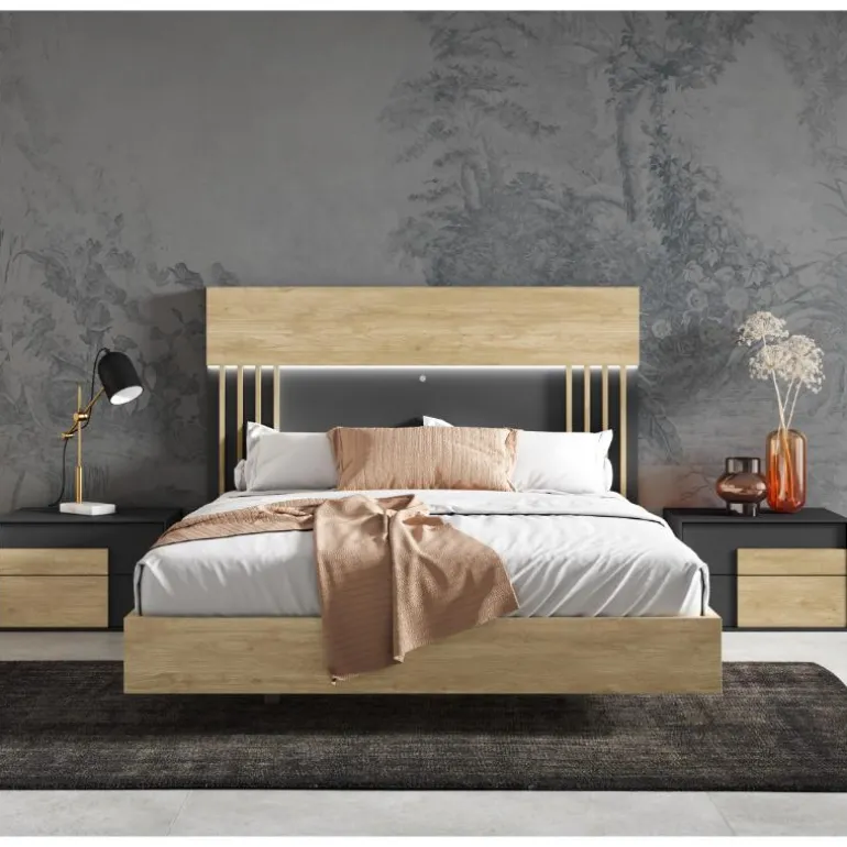 En fotografía está en acabado Roblerus y Pizarra, combinado en cabecero y mesillas, que combina fácilmente con cualquier otro tono, con detalle alistonado en blanco con fondo roble, pudiendo escoger los colores que usted prefiera.