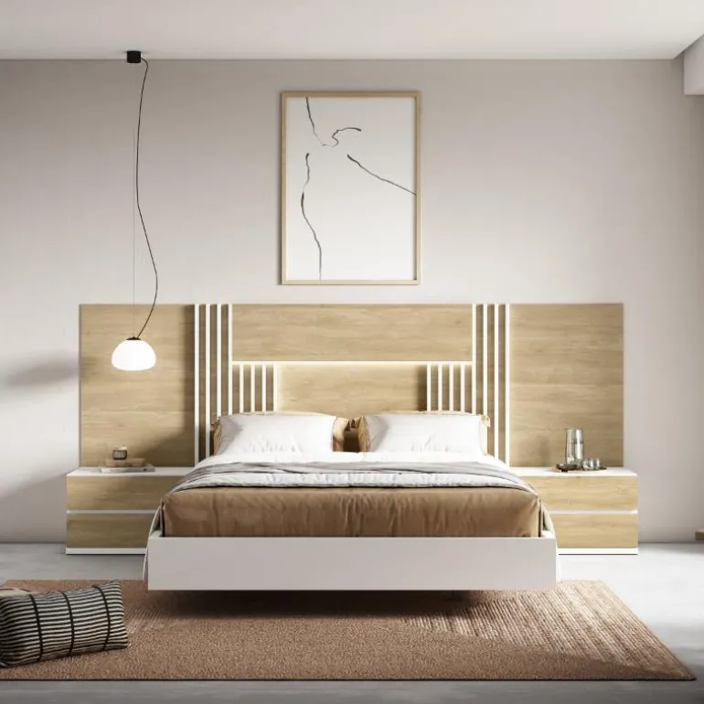En fotografía está en acabado Roblerus y Lacablan, combinado en cabecero y mesillas, que combina fácilmente con cualquier otro tono, con detalle alistonado en blanco con fondo roble, pudiendo escoger los colores que usted prefiera.