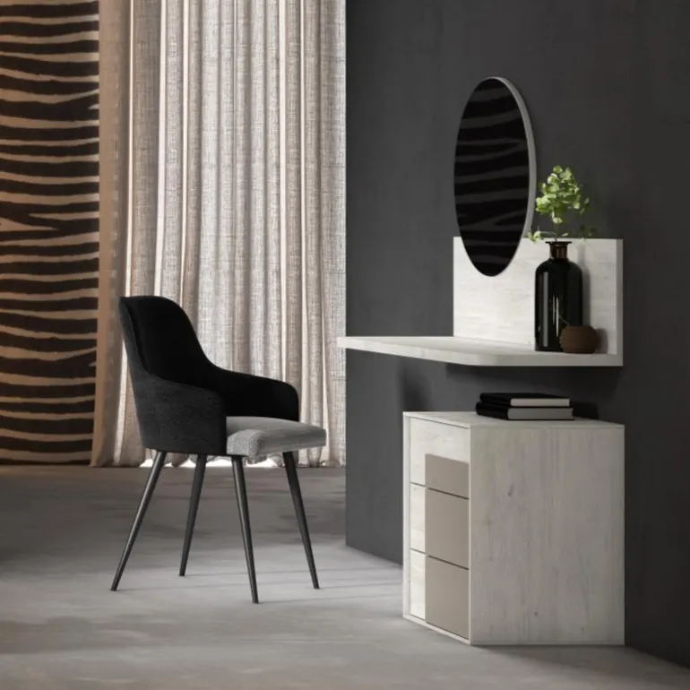 Y mesitas colgadas en mismo acabado Volcán y estructura Nórdico, con cajones con tirador asimétrico. Y bancada a juego suspendida con esquinas rectas. Todo a la última en decoración.