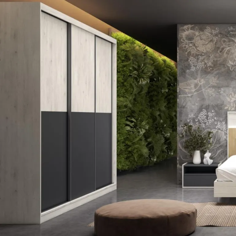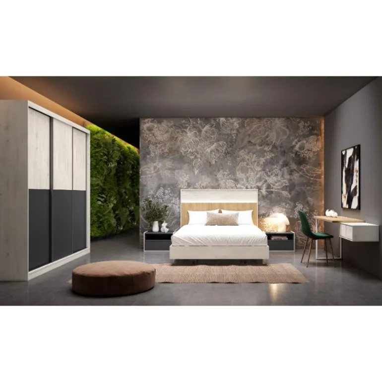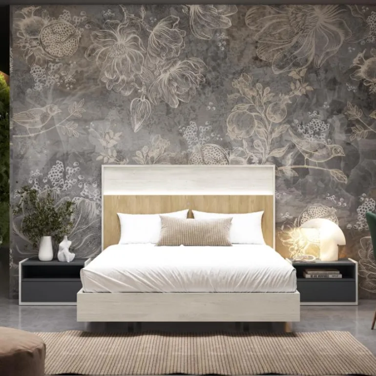 En fotografía el cabecero está en acabado Nórdico y Roblerus, y mesilla en Pizarra y Nórdico, que combina fácilmente con cualquier otro tono, con detalle de iluminación LED.